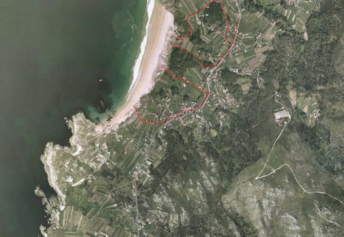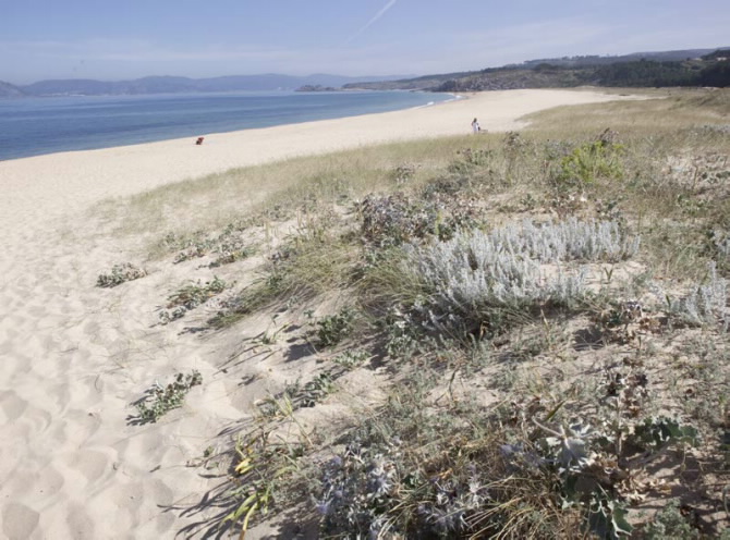 Un arenal de arena fina y oleaje moderado, mixta (nudista y textil en toda la playa), a sólo 52 km de Santiago de Compostela (menos de 40 minutos por el Corredor de Noia que cuenta con un puente que evita entrar en NOIA y acorta el viaje en unos 10 minutos con respecto al trazado anterior).